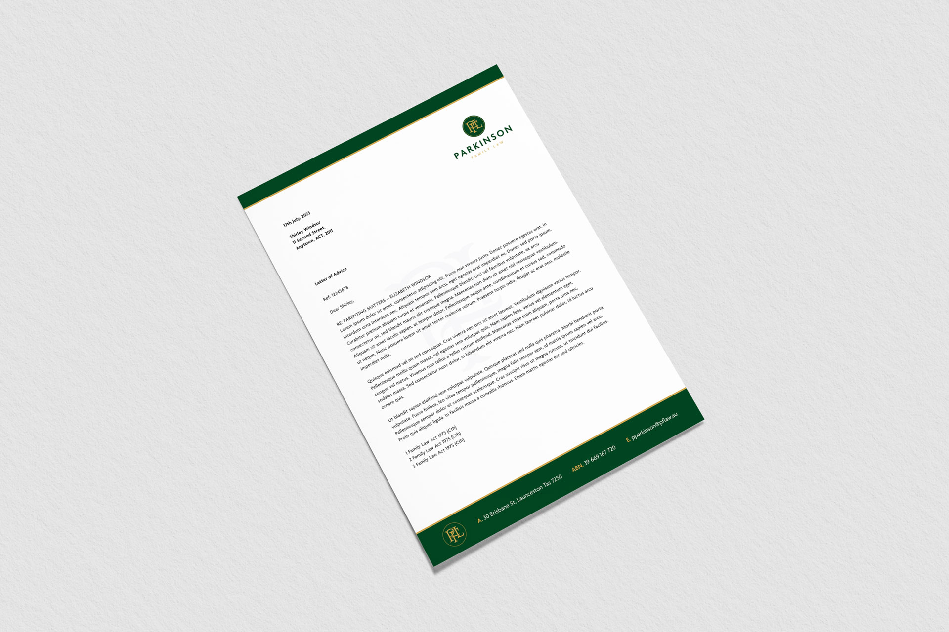 Our creative work continued to print, with the creation of a letterhead, business cards and folders, ensuring that every visual aspect of Parkinson Family Law exemplifies professionalism and trust.